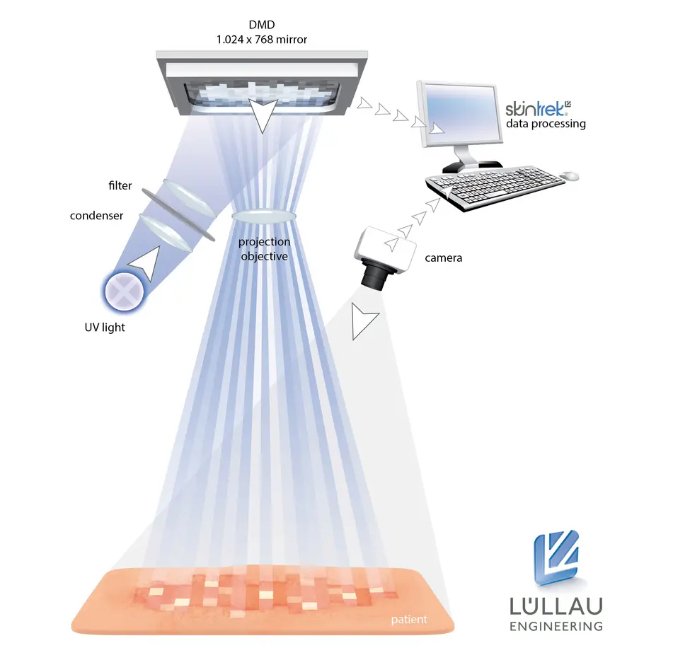 "During treatment it is important that as little healthy skin as possible is irradiated in order to minimize the risk of skin cancer," explains Friedrich Lüllau, who is considered the founder of digital phototherapy. The development goal of the new skintrek® PT5 UV radiation device was to avoid exposing healthy skin, even if the patient moves. The exposure head has to be able to follow the slightest of movements.