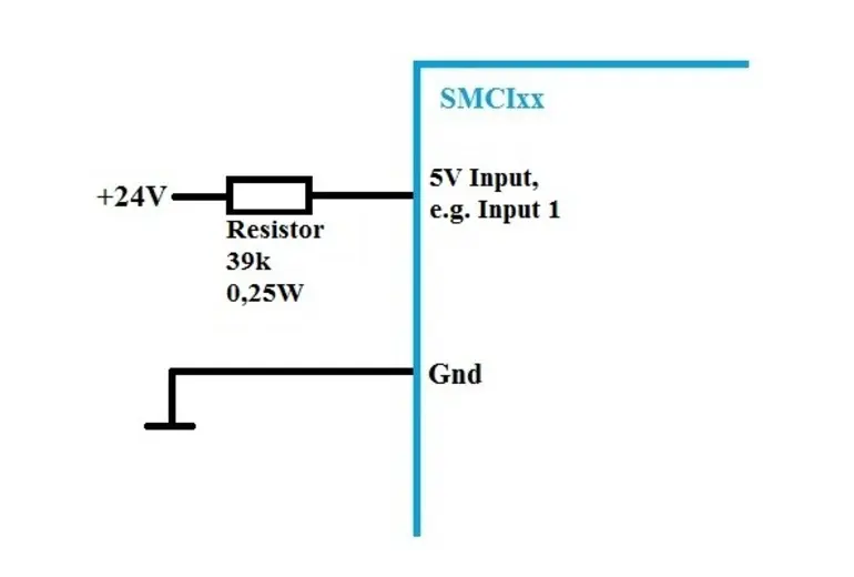 Applying 24V to 5V only digital input for SMCI Series Motor controllers/drives Configuration examples Motors with controllers/drives Configuration examples The controllers SMCI12, SCMI36 and SCMP33 have 5 V inputs. If a 24 V control signal is to be applied, it will require a 39 kOhm (0.25 W) resistor be connected in series to each input in use.