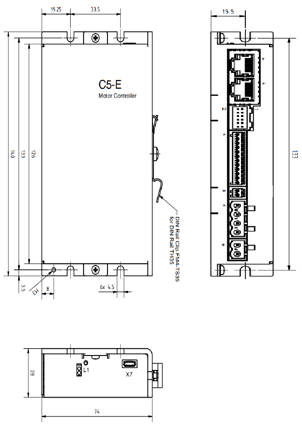 Maßzeichnungen und Montagemöglichkeiten Sie können die Steuerung mit Schrauben an den seitlichen Laschen auf eine ebene Montagefläche oder mit der mitgelieferten Hutschienenklammer an einer TH35-Hutschiene in Ihrem Schaltschrank befestigen.