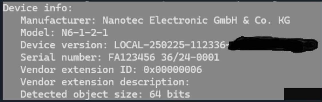USB-Anschluss HINWEIS image/svg+xml Beschädigung des Produkts und/oder externer Hardware durch Potenzialdifferenzen am USB. Das Anschließen des USB-Kabels während die Elektronik versorgt wird (Hot-Plugging), führt möglicherweise zu Schäden. ► USB anschließen, bevor Sie die Versorgungsspannung einschalten. ► Wenn möglich, Potentialdifferenzen zwischen PC und Produkt ausgleichen oder USB-Isolator verwenden. ► USB-Kabel zuerst an das Produkt anschließen, dann an den PC. Wird die Steuerung über ein USB-Kabel mit einem PC verbunden, wird im Windows-Dateiexplorer ein MTP-Gerät angelegt, das einen Datenträger enthält. Es werden bis zu drei Dateien angezeigt, die Konfigurationsdatei (cfg*.txt), die Firmware (*.fw) und das NanoJ-Programm (nanoj*.usr), welches sofort nach dem Neustart der Steuerung intern gespeichert und nicht mehr angezeigt wird. Sie können somit die Konfigurationsdatei oder das NanoJ-Programm auf die Steuerung speichern. Die Spannungsversorgung der Steuerung muss beim USB-Betrieb ebenfalls angeschlossen sein. Anmerkung: Benutzen Sie ausschließlich ein standardisiertes USB-Kabel, Typ C. Benutzen Sie keinesfalls USB-Kabel, die Hersteller von Mobiltelefonen ihren Produkten beilegen. Diese USB-Kabel können eine andere Steckerform oder Pin-Belegung aufweisen. Speichern Sie keine anderen Dateien auf der Steuerung als die nachfolgend aufgelisteten: cfg*.txt nanoj*.usr reset.txt Andere Dateien werden von der Steuerung nicht akzeptiert. PowerShell-Scripts Im Download-Bereich der Produktwebseite auf nanotec.com finden Sie die Datei mtp.ps1 mit Beispielen für die Windows-PowerShell-Konsolle. Damit können Sie: Alle gespeicherten Dateien auflisten:.\mtp.ps1 -Action list -DeviceName N6-1-1-1 Eine Datei aus dem aktuellen Script-Ordner auf das Gerät kopieren:.\mtp.ps1 -Action copy -DeviceName N6-1-1-1 -FileName cfg_Example.txt Eine Datei löschen:.\mtp.ps1 -Action delete -DeviceName N6-1-1-1 -FileName cfg_Example.txt MTP in LinuxNanotec empfiehlt folgende: MTP-Tools. Sollten das oft in Linux-Distributionen inkludierten GVfs bereits installiert sein, vorher dieses deinstallieren:sudo apt remove gvfsAnschließend MTP-Tools und libmtp installieren und neustarten: sudo apt-get install mtp-tools sudo apt-get install libmtp-runtime reboot Nach dem Anschließen des USB prüfen, ob das Gerät erkannt wird:mtp-detectDas Gerät antwortet darauf mit seinen Eigenschaften (Hersteller, Bezeichnung, Seriennummer etc.), ähnlich wie in der nachfolgenden Abbildung.Sie können nun: Alle gespeicherten Dateien mit ihrer ID auflisten:mtp-files Eine Datei aus dem aktuellen Script-Ordner auf das Gerät kopieren (der Name muss identisch sein):mtp-sendfile cfg_Out.txt cfg_Out.txt Eine Datei aus dem Gerät kopieren (File-ID wie von mtp-files gelistet):mtp-getfile 1072922872 cfg_Or.txt Eine Datei löschen:mtp-delfile -f cfg_Example.txt