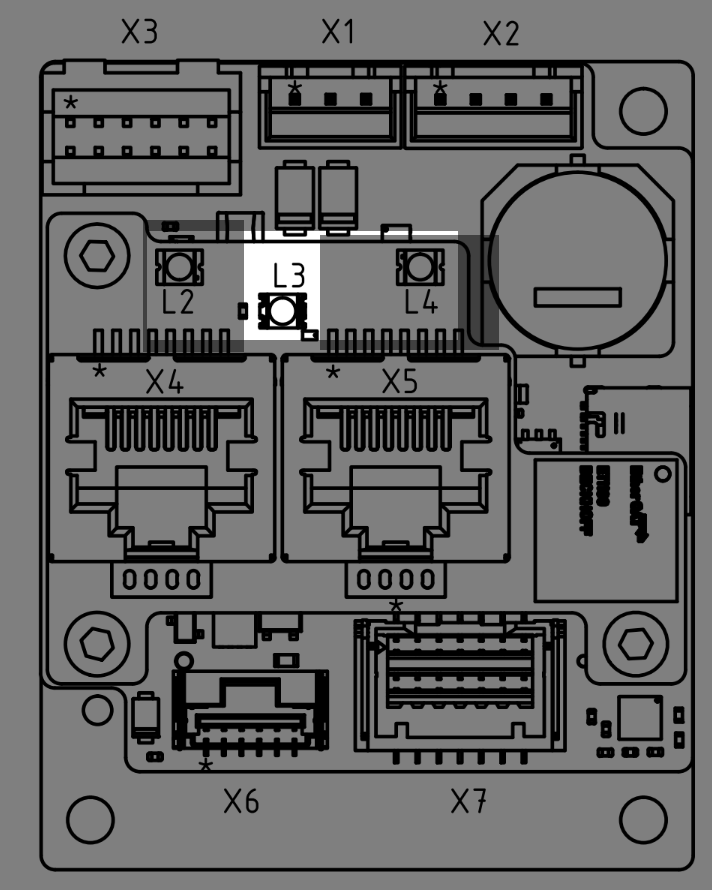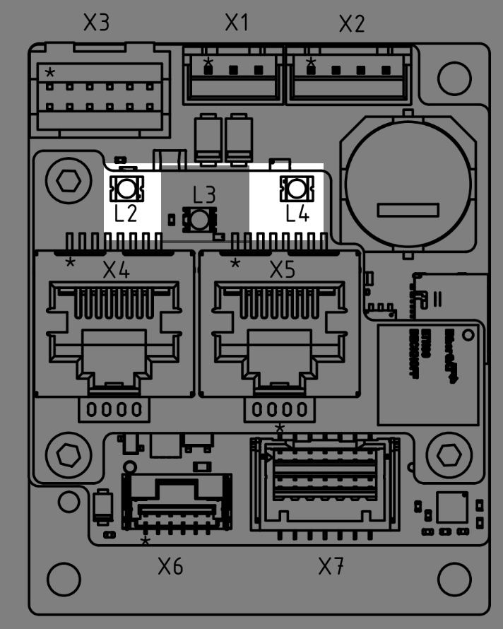 EtherCAT-LEDs Die Steuerung verfügt über 3 LEDs (LINK, RUN, ERR), die den Status der Steuerung am EtherCAT-Bus anzeigen. LINK Die grünen LEDs LINK sind an, wenn das EtherCAT-Kabel angeschlossen ist und blinken bei Datenverkehr (L4 für EtherCAT IN und L2 für OUT). RUN Die grüne LED RUN (L3) zeigt einen der folgenden Status der Steuerung (EtherCAT-Slave) an: LED-Verhalten Status Voraussetzung dauerhaft aus INIT Der Slave ist im Initialisierungs-Zustand. blinkend PRE-OPERATIONAL Der Slave ist im Zustand PRE-OPERATIONAL. Einzelblitz SAFE-OPERATIONAL Der Slave ist im Zustand SAFE-OPERATIONAL . dauerhaft grün OPERATIONAL Der Slave ist im Zustand OPERATIONAL. ERR Die rote LED ERR (L3) zeigt einen der folgenden Status der Steuerung (EtherCAT-Slave) an: LED-Verhalten Status Voraussetzung dauerhaft aus No error Kein Fehler blinkend Invalid Configuration Allgemeiner Konfigurationsfehler Einzelblitz Local Error Der Slave hat seinen EtherCAT-Status wegen eines lokalen Fehlers selbstständig geändert. Zweifach-Blitz Process Data Watchdog Timeout/ EtherCAT Watchdog Timeout Watchdog-Timeout dauerhaft rot Application controller failure Der Slave reagiert nicht mehr.