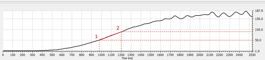 Beschreibung Der Wert hängt von der Trägheit der Last ab. Um den Faktor zu ermitteln: Aktivieren Sie den Closed Loop und wählen Sie den Modus Profile Torque . Stellen Sie eine Zielvorgabe für das Drehmoment und tragen Sie den Wert in 320Dh:01h ein. Zeichnen Sie (z. B. im Plug & Drive Studio) die aktuelle Geschwindigkeit (Objekt 606Ch) auf. Berechnen Sie die Beschleunigung in den eingestellten benutzerdefinierten Einheiten für den Drehzahlbereich, wo diese konstant ist. Tragen Sie den Wert in 320Dh:02h ein. Am Beispiel der Drehzahl-Kurve in der folgenden Abbildung: (90-50)/(1200-980)=182 U/min pro Sekunde.