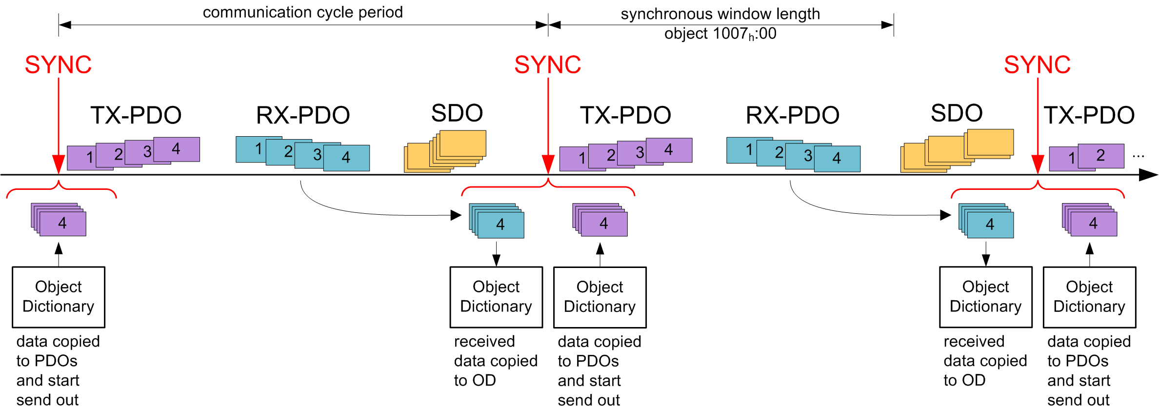 Nach dem Erhalt einer SYNC-Nachricht gibt es ein Zeitfenster ("synchronous window"), innerhalb dessen PDO-Nachrichten gesendet und empfangen werden dürfen. Ist die Zeit des Fensters abgelaufen, müssen alle Geräte das Senden von PDOs einstellen. Die "synchronous window length" kann im Objekt 1007h:00h in Mikrosekunden eingestellt werden.
