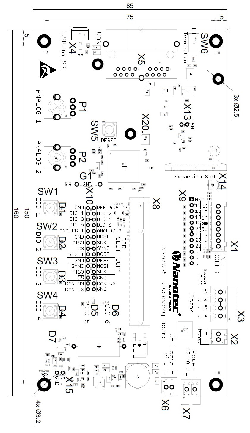 Anschlussbelegung - Discovery Board NP5 Stecker Funktion X1 Encoder 1 und Hallsensor X2 Bremse X3 Motor X5 CANopen X6 Logik-Spannung X7 Spannungsversorgung X8 Steckplatz für NP5 Steuerung, siehe auch Maßzeichnungen und Anschlussbelegung X9 Encoder 1/2 und Hallsensor X10 GPIO und Kommunikationsschnittstelle X13 Jumper zum Aktivieren/Deaktivieren der CANopen-Kommunikation X14 Flachbandkabelbuchse für EtherCAT-Zusatzplatine X15 +5V DC-Ausgang P1 Potenziometer für den Analogeingang 1 P2 Potenziometer für den Analogeingang 2 SW1 bis SW4 Taster für GPIO 1 bis GPIO 4 SW5 Reset-Taster für das Discovery Board SW6 Schalter für 120 Ohm Terminierungswiderstand (CANopen) D1 bis D6 Statusanzeige für GPIO 1 bis GPIO 6 D7 Statusanzeige für das Discovery Board (+3,3 V DC ) G1 Erdungsanschluss Stecker X1 - Encoder 1 und Hallsensor Der Stecker X1 hat folgende Eigenschaften: Stecker-Typ: Phönix Grundleiste, MCV-0,5/8-G-2,5 Spannungspegel: +5 V Logikpegel Strombelastbarkeit: max. 300 mA (zusammen mit +5 V DC Ausgangsspannung auf der Stiftleiste X15) Hall-Eingänge: intern durch 2,7 kΩ Pull-up Widerstand an +5 V DC angeschlossen Pin Name/Funktion 1 Hall_U (H1) 2 Hall_V (H2) 3 Hall_W (H3) 4 +5 V DC 5 GND 6 ENC1_A 7 ENC1_B 8 ENC1_I Stecker X2 - Bremse Der Stecker X2 hat folgende Eigenschaften: Stecker-Typ: Phönix Grundleiste, MCV-0,5/2-G-2,5 Pin Name/Funktion 1 Bremse + (mit +UB verbunden) 2 Bremse - (PWM-gesteuerter Open-Drain-Ausgang, max. 1,5 A) Stecker X3 - Motor Der Stecker X3 hat folgende Eigenschaften: Stecker-Typ: Phönix Grundleiste, MCV-1,5/4-G-3,5 max. Nennstrom 6A RMS max. Spitzenstrom 10A RMS (für 1s) Pin Schrittmotor BLDC-Motor 1 A U 2 A\ V 3 B W 4 B\ Stecker X5 - CANopen Der Stecker X5 hat folgende Eigenschaften: Stecker-Typ: RJ45 Duo Port, liegend Pin Name/Funktion 1 CAN_H 2 CAN_L 3 GND 4 N.C 5 N.C 6 CAN_Shield 7 GND 8 +UB_Logic (24 V DC ±5%) Stecker X6 - Logik-Spannung Der Stecker X6 hat folgende Eigenschaften: Stecker-Typ: Phönix Grundleiste, MCV-0,5/2-G-2,5 Pin Name/Funktion 1 +UB_Logic (24 V DC ±5%) 2 GND Stecker X7 - Betriebsspannung Der Stecker X7 hat folgende Eigenschaften: Stecker-Typ: Phönix Grundleiste, MCV-1,5/2-G-3,5 Pin Name/Funktion 1 +UB (12…48 V DC ±5%) 2 GND Stecker X9 - Encoder und Hallsensoren Der Stecker X9 hat folgende Eigenschaften: Stecker-Typ: Stiftleiste, einreihig, RM 2.54 mm, 12-polig, stehend Spannungspegel: +5 V DC Logikpegel Pin Name/Funktion 1 GND 2 ENC1_A 3 ENC1_B 4 ENC1_I 5 ENC1_CAP 6 ENC2_A 7 ENC2_B 8 ENC2_I 9 ENC2_CAP 10 Hall_U (H1) 11 Hall_V (H2) 12 Hall_W (H3) Stecker X10 - I/O und Kommunikationsschnittstelle Der Stecker X10 hat folgende Eigenschaften: Stecker-Typ: Stiftleiste, zweireihig, RM 2.54mm, 2x15 polig, stehend Pin Name Typ Anmerkung 1 GND Masse 2 U_REF_ANALOG Out Analog-Referenzspannung 3 DIO1_IO_CS I/O General I/O 4 DIO2_CD_CLK I/O General I/O 5 DIO3_CD_DIR I/O General I/O 6 DIO4_IO_MOSI I/O General I/O 7 DIO5_IO_MISO I/O General I/O 8 DIO6_IO_CLK I/O General I/O 9 ADC_ANALOG_1 In AD-Wandler 1 10 ADC_ANALOG_2 In AD-Wandler 2 11 GND Masse 12 SLOT_SPI_MOSI - SPI 1 13 SLOT_SPI_MISO - SPI 1 14 SLOT_SPI_SCK - SPI 1 15 SLOT_SPI_CS - SPI 1 16 SLOT_SYNC - Systemfunktion, reserviert 17 SLOT_RESET - Systemfunktion, reserviert 18 SLOT_BOOT - Systemfunktion, reserviert 19 GND Masse 20 COMM_RESET - Systemfunktion, reserviert 21 COMM_SYNC - Systemfunktion, reserviert 22 COMM_SPI_MOSI - SPI 2 23 COMM_SPI_MISO - SPI 2 24 COMM_SPI_SCK - SPI 2 25 COMM_SPI_CS - SPI 2 26 GND Masse 27 CANopen ON - CANopen ON 28 I2CSCL_CANRX - I2C Clock oder CANopen RX 29 I2CSDA_CANTX - I2C Data oder CANopen TX 30 GND Masse Stecker X13 - Jumper zum Aktivieren/Deaktivieren der CANopen-Kommunikation Der Stecker X13 hat folgende Eigenschaften: Stecker-Typ: Stiftleiste, RM 2.54mm, 2 polig, stehend Mit Jumper gebrückt: CANopen aktiviert Mit Jumper nicht gebrückt: CANopen deaktiviert, EtherCAT aktiviert Pin Name/Funktion 1 +3,3V 2 CANopen ON Stecker X15 - +5V DC Ausgang Der Stecker X15 hat folgende Eigenschaften: Stecker-Typ: Stiftleiste, RM 2.54 mm, 2 polig, stehend Strombelastbarkeit: max. 300 mA (zusammen mit +5 V DC Ausgangsspannung auf der Stiftleiste X1) Pin Name/Funktion 1 +5 V DC 2 GND