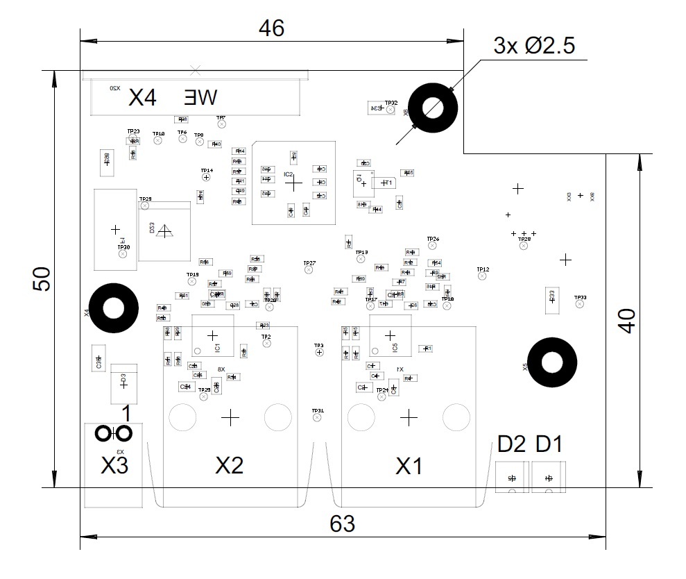 Erweiterung für EtherCAT (Zusatzplatine) Das Discovery Board DK-NP5-68 ist mit einer Zusatzplatine für die Kommunikation über EtherCAT ausgestattet. Maßzeichnungen – Zusatzplatine ETHERCAT Die Maße sind in [mm]. Hardwareübersicht - Zusatzplatine ETHERCAT Name Funktion Anmerkung X1 EtherCAT IN X2 EtherCAT OUT X4 Verbindung zu Discovery Board NP5 D1 Statusanzeige ERROR für EtherCAT D2 Statusanzeige RUN für EtherCAT