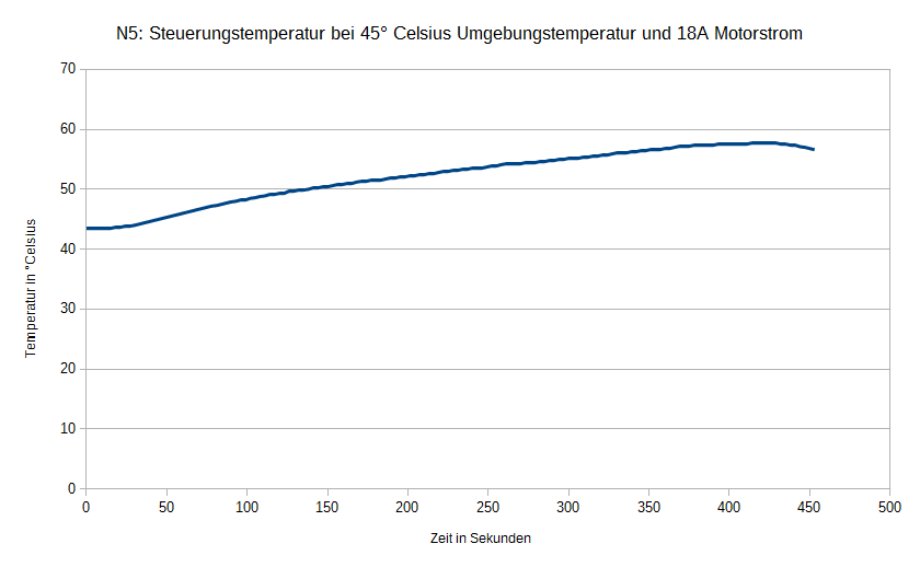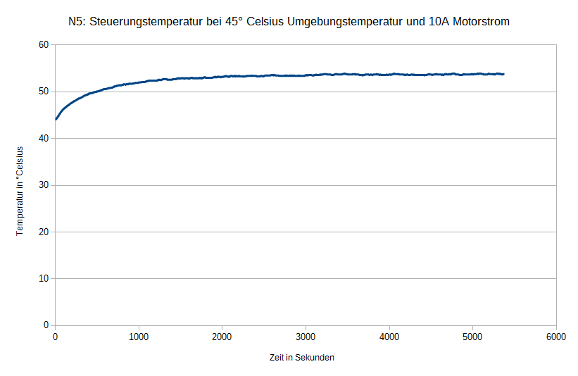 Übertemperaturschutz Ab einer Temperatur von ca. 75°C auf der Leistungsplatine (entspricht 65 - 72°C außen am Deckel) wird das Leistungsteil der Steuerung abgeschaltet und das Fehlerbit gesetzt (siehe Objekt 1001h und 1003h). Nach Abkühlung und dem Bestätigen des Fehlers (siehe Tabelle für das Contolword, "Fault reset") funktioniert die Steuerung wieder normal. Die folgenden Ergebnisse von Temperaturtests geben einen Hinweis auf das Temperaturverhalten dieser Steuerung. Es wurden Temperaturtests unter folgenden Bedingungen durchgeführt: Betriebsspannung: 48 V DC Motorstrom: 10 A (N5-1-x low current)/18 A (N5-2-x high currrent) effektiv Operationsmodus: Drehzahlmodus Vollschritt, 30 U/min Umgebungstemperatur: 45°C Aufstellhöhe: 500 m über NN keine externe Kühlung im Klimaschrank, z. B. über Lüfter Die folgenden Grafiken zeigen die Ergebnisse der Temperaturtests: Bei 45 °C (48 V, 10 A effektiv, Drehzahlmodus 30 U/min) ist die N5-1-x länger als 1 Stunde in Betrieb gewesen ohne Abschaltung. Die Temperatur war stabil bei ca. 53°C. Bei 45 °C (+48 V, 18 A effektiv, Drehzahlmodus 30 U/min) hat der Temperaturschutz die N5-2-x in weniger als 8 Minuten abgeschaltet. Anmerkung: Da das genaue Temperaturverhalten außer vom Motor auch von der Anflanschung und dem dortigen Wärmeübergang sowie von der Konvektion in der Applikation abhängt, empfehlen wir bei Applikationen, die hinsichtlich Stromhöhe und Umgebungstemperatur problematisch sind, immer einen Dauertest in der realen Umgebung.