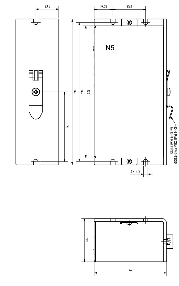 Maßzeichnungen und Montagemöglichkeiten Sie können die Steuerung mit Schrauben an den seitlichen Laschen auf eine ebene Montagefläche oder mit der mitgelieferten Hutschienenklammer an einer TH35-Hutschiene in Ihrem Schaltschrank befestigen.