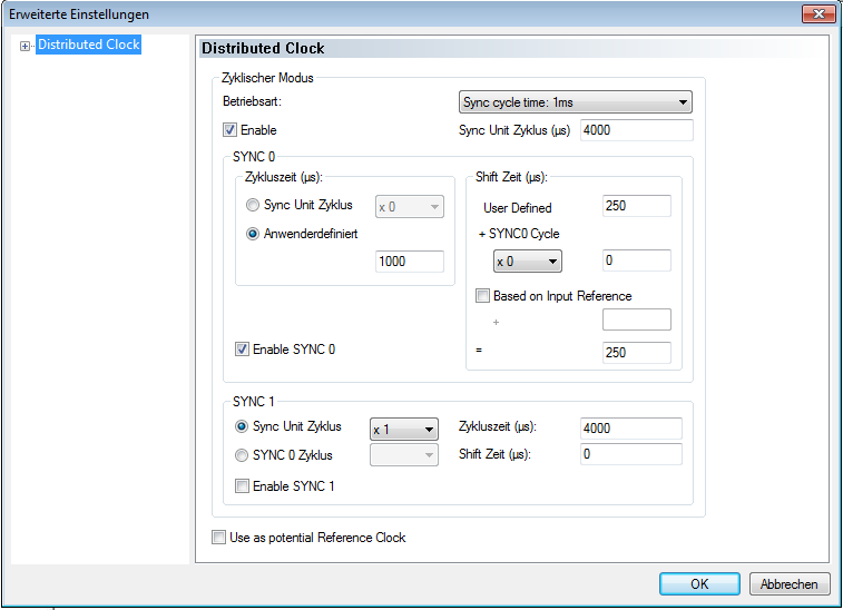 Software Verbindung Tipp: Die nachfolgende Beschreibung geht davon aus, dass ein EtherCAT-Master von Beckhoff mit der Software TwinCAT benutzt wird. Verbinden Sie den EtherCAT Master mit der Steuerung, siehe Technische Daten und Anschlussbelegung. Versorgen Sie die Steuerung mit Spannung. Beschaffen Sie sich die, exakt zur verwendeten Firmware-Version passende, ESI-Datei unter folgenden Quellen: Über die Nanotec Homepage www.nanotec.com. Die aktuelle Version der Firmware und der ESI-Datei finden Sie im Download-Ordner von Plug & Drive Studio. Vom Nanotec-Support. Schließen Sie den System Manager von TwinCAT falls er geöffnet ist. Kopieren Sie anschließend die ESI-Datei in den Unterordner von TwinCAT: Falls Sie TwinCAT Version 2 benutzen, verwenden Sie den Ordner <TWINCAT INSTALL DIR>/Io/EtherCAT Falls Sie TwinCAT Version 3 benutzen, verwenden Sie den Ordner <TWINCAT INSTALL DIR>/3.1/Config/Io/EtherCAT Beispiel Beispiel: Sollte auf Ihrem PC TwinCAT 2 unter dem Pfad C:\TwinCAT\ installiert sein, kopieren Sie die ESI-Datei in den Pfad C:\TwinCAT\Io\EtherCAT\. Öffnen Sie die ESI-Datei mit einem Editor. Suchen Sie nach dem Parameter AddInfo. Tragen Sie ein: den Wert "2", falls Sie die Steuerung als Box einbinden möchten (Werkseinstellung) den Wert "0", falls Sie die Steuerung als NC-Axis einbinden möchten Speichern und schließen Sie die Datei. Starten Sie jetzt wieder den TwinCAT System Manager. Nach einem Neustart werden die ESI-Dateien neu eingelesen. Anmerkung: Die Zykluszeit des Sync-Signals muss immer auf 1ms stehen. Sie können die Bus-Zykluszeit (und entsprechend die Interpolationszeit in 60C2h) auf ganzzahlige Vielfache von 1 ms setzen.