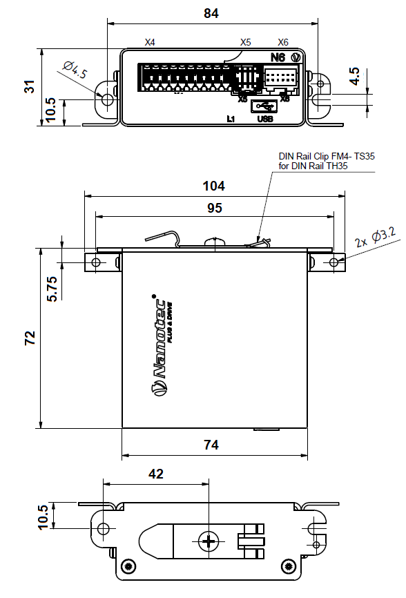 Maßzeichnungen und Montagemöglichkeiten Sie können die Steuerung mit Schrauben an den seitlichen Laschen auf eine ebene Montagefläche oder mit der mitgelieferten Hutschienenklammer an einer TH35-Hutschiene in Ihrem Schaltschrank befestigen.