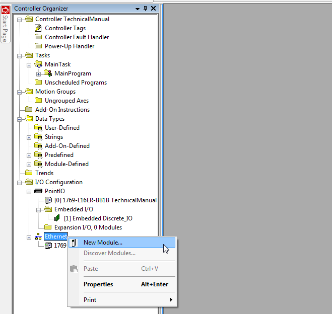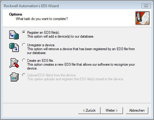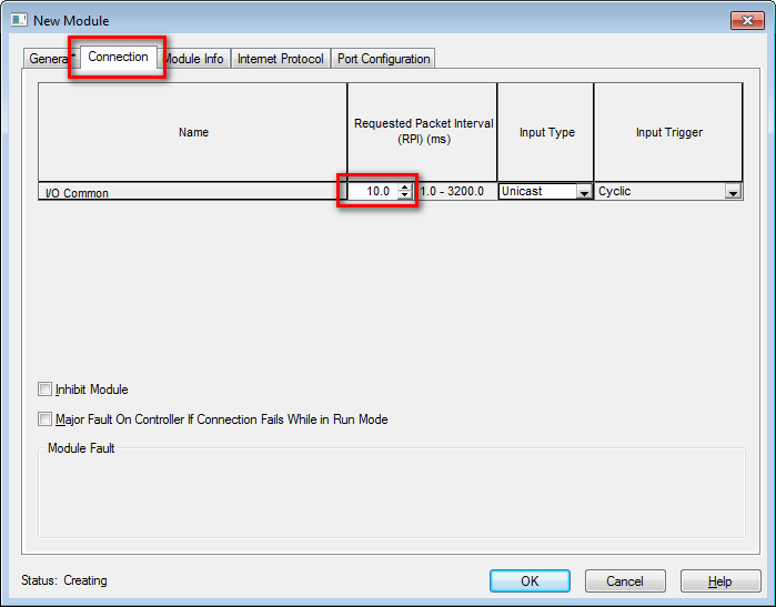Software Verbindung Standardmäßig ist die Steuerung im DHCP-Modus, daher wird ein DHCP-Server in dem Netzwerk benötigt. Falls kein DHCP-Server verfügbar ist oder die Steuerung mit einer festen IP-Adresse arbeiten soll, kann das Tool BOOTP/DHCP von Rockwell benutzt werden. Mit diesem Tool lässt sich entweder eine IP-Adresse mittels DHCP der Steuerung zuweisen oder es lässt sich eine statische Adresse zuweisen und DHCP deaktivieren. BOOTP wird von der Steuerung nicht unterstützt. Falls Sie einen eigenen DHCP-Server besitzen und die IP-Adresse herausfinden wollen, lässt sich das am einfachsten über das Tool ping bewerkstelligen. Dazu muss der NetBIOS-Service auf dem PC aktiviert sein und die MAC-Adresse der Steuerung muss bekannt sein. Beispiel Falls die Steuerung mit der MAC Adresse 44:AA:E8:00:02:9F angesprochen werden soll, ist der Aufruf für das Tool in einer Shell oder Command-Line:ping MAC-44AAE800029F Sie müssen die nächsten Schritte im Rockwell Logix Designer machen: Benutzen sie die Software RSLinx Classic, um einen EtherNet/IP™-Treiber zu erstellen. Schlagen Sie im entsprechenden Handbuch zur Hilfe nach. Wählen Sie den Projekt-Pfad der PLC. Importieren der EDS-Datei der Steuerung: Klicken Sie auf Tools\EDS Hardware Installation Tool, wählen sie Register an EDS file(s). Wählen sie anschließend die korrekte EDS-Datei aus und importieren Sie diese. Klicken Sie mit der rechten Maustaste auf Ethernet im Controller Organizer und wählen Sie New Module…. Wählen Sie die Registerkarte Catalog, suchen Sie den Eintrag PD4-E und wählen Sie das Gerät, mit dem Sie arbeiten wollen. Anschließend wird die Eingabemaske New Module geöffnet. Wählen Sie die Registerkarte General und geben Sie einen Namen und die IP-Adresse für das Gerät ein. Die Benutzung des Host Name wird nicht unterstützt. Klicken Sie auf Change, um eine der Assemblies auszuwählen (entweder IIO Common oder I/O PDI, siehe Kapitel Assembly-Objekte). Wählen Sie die Registerkarte Connection und geben Sie einen RPI-Wert für die I/O Common-Daten an, wie es in der nachfolgenden Abbildung gezeigt wird. Zudem kann der input type zwischen unicast und multicast geändert werden. Zum Schluss schließen Sie die Maske mit einem Klick auf OK.