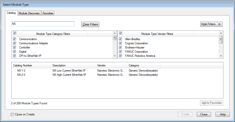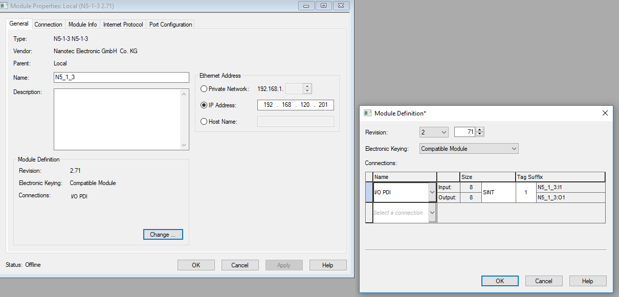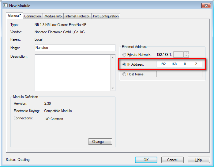 Inbetriebnahme EtherNet/IP Diese Steuerung ist mit einer EtherNet/IP™-Schnittstelle ausgestattet. Lesen Sie das Kapitel EtherNet/IP für weitere Details. Anmerkung: Nanotec Steuerungen basieren immer auf dem CANopen-Standard CiA402. Daher werden alle Attribute in einem sogenannten Objektverzeichnis (engl. object dictionary) gespeichert. Diese können mit einem Index und einem Subindex adressiert werden. z.B. 1018h:01h. Der Index ist ein 16-bit Wert und der Subindex ein 8-bit Wert. Die Steuerung bietet EtherNet/IP™, aber dieses Protokoll hat ein anderes Vorgehen: alle Attribute werden auf Basis von Objekten gespeichert. Aus diesem Grund nutzt der PD4-E eine Zuordnung um eine Brücke zwischen EtherNet/IP™ und CANopen zu schlagen. Als Folge ist die Konfiguration dieser Steuerung anders als bei normalen EtherNet/IP™-Geräten. Die folgende Inbetriebnahme-Prozedur geht davon aus dass eine CompactLogix PLC und Studio 5000 Software von Rockwell benutzt werden. Anschluss Schließen Sie die Versorgungsspannung an den Stecker X3 (siehe Kapitel X3 − Spannungsversorgung) an. Verbinden Sie die Rockwell CompactLogix PLC mit dem Anschluss X1 der Steuerung (siehe Kapitel Stecker X1 - Ethernet/IP). Software Verbindung Standardmäßig ist die Steuerung im DHCP-Modus, daher wird ein DHCP-Server in dem Netzwerk benötigt. Falls kein DHCP-Server verfügbar ist oder die Steuerung mit einer festen IP-Adresse arbeiten soll, kann das Tool BOOTP/DHCP von Rockwell benutzt werden. Mit diesem Tool lässt sich entweder eine IP-Adresse mittels DHCP der Steuerung zuweisen oder es lässt sich eine statische Adresse zuweisen und DHCP deaktivieren. BOOTP wird von der Steuerung nicht unterstützt. Falls Sie einen eigenen DHCP-Server besitzen und die IP-Adresse herausfinden wollen, lässt sich das am einfachsten über das Tool ping bewerkstelligen. Dazu muss der NetBIOS-Service auf dem PC aktiviert sein und die MAC-Adresse der Steuerung muss bekannt sein. Beispiel Falls die Steuerung mit der MAC Adresse 44:AA:E8:00:02:9F angesprochen werden soll, ist der Aufruf für das Tool in einer Shell oder Command-Line:ping MAC-44AAE800029F Sie müssen die nächsten Schritte im Rockwell Logix Designer machen: Benutzen sie die Software RSLinx Classic, um einen EtherNet/IP™-Treiber zu erstellen. Schlagen Sie im entsprechenden Handbuch zur Hilfe nach. Wählen Sie den Projekt-Pfad der PLC. Importieren der EDS-Datei der Steuerung: Klicken Sie auf Tools\EDS Hardware Installation Tool, wählen sie Register an EDS file(s). Wählen sie anschließend die korrekte EDS-Datei aus und importieren Sie diese. Klicken Sie mit der rechten Maustaste auf Ethernet im Controller Organizer und wählen Sie New Module…. Wählen Sie die Registerkarte Catalog, suchen Sie den Eintrag PD4-E und wählen Sie das Gerät, mit dem Sie arbeiten wollen. Anschließend wird die Eingabemaske New Module geöffnet. Wählen Sie die Registerkarte General und geben Sie einen Namen und die IP-Adresse für das Gerät ein. Die Benutzung des Host Name wird nicht unterstützt. Klicken Sie auf Change, um eine der Assemblies auszuwählen (entweder IIO Common oder I/O PDI, siehe Kapitel Assembly-Objekte). Wählen Sie die Registerkarte Connection und geben Sie einen RPI-Wert für die I/O Common-Daten an, wie es in der nachfolgenden Abbildung gezeigt wird. Zudem kann der input type zwischen unicast und multicast geändert werden. Zum Schluss schließen Sie die Maske mit einem Klick auf OK.