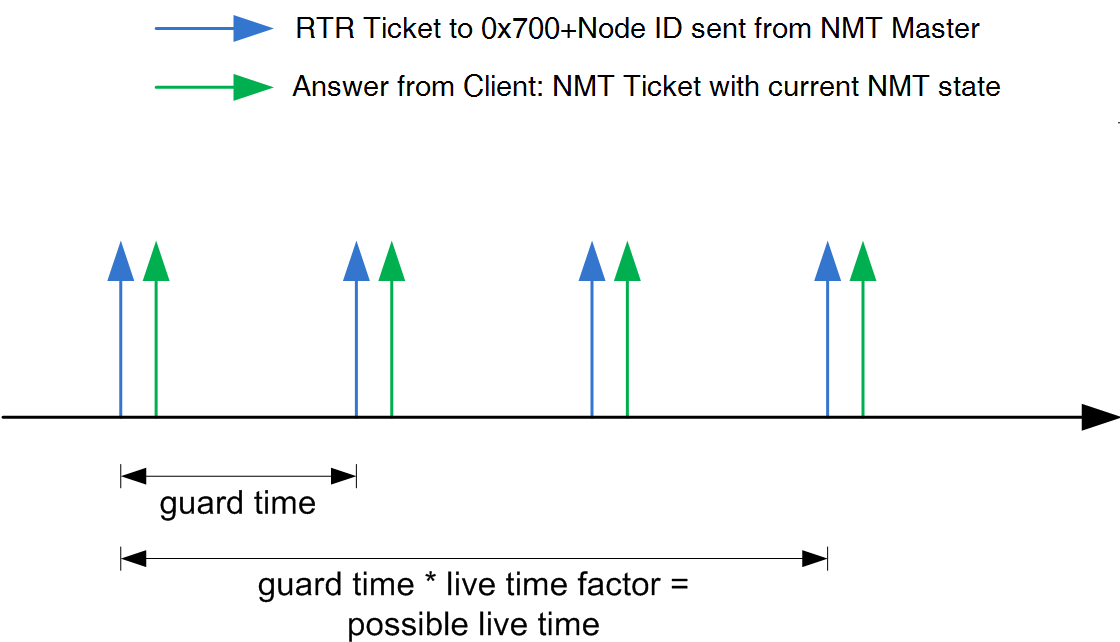 • guard time: Die Zeit, zwischen zwei RTR-Nachrichten. Diese kann für jeden CAN-Knoten unterschiedlich sein und wird im Slave im Objekt 100Ch:00 hinterlegt (Einheit: Millisekunden)