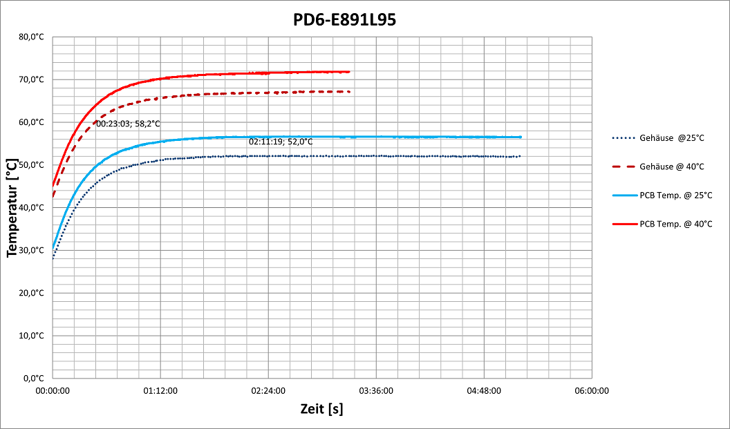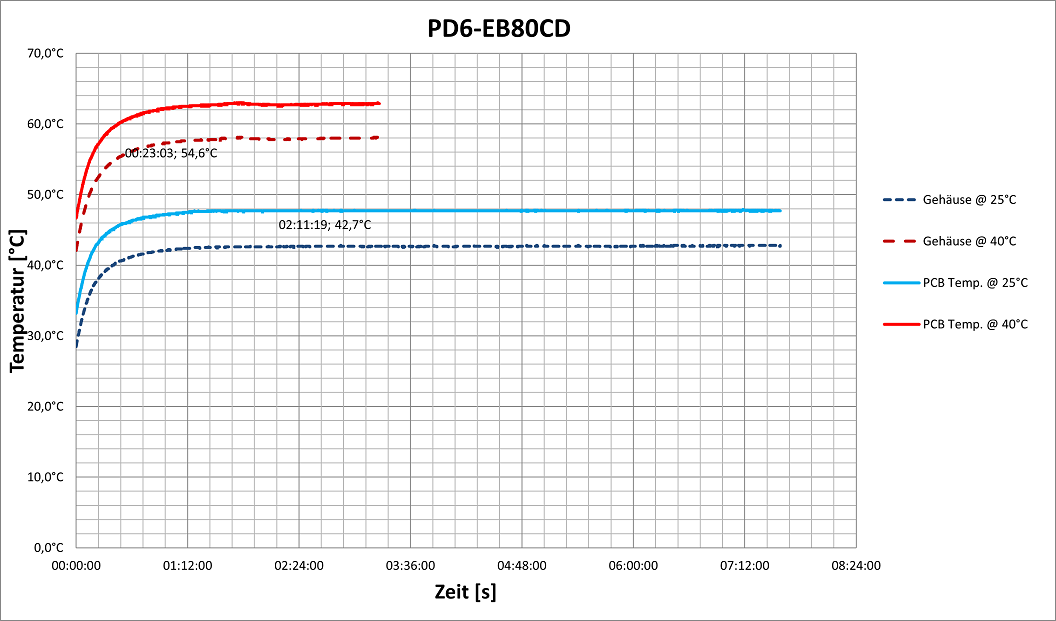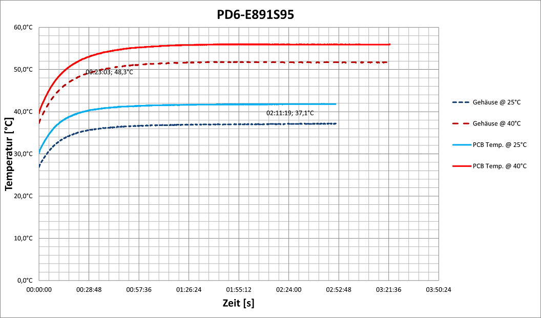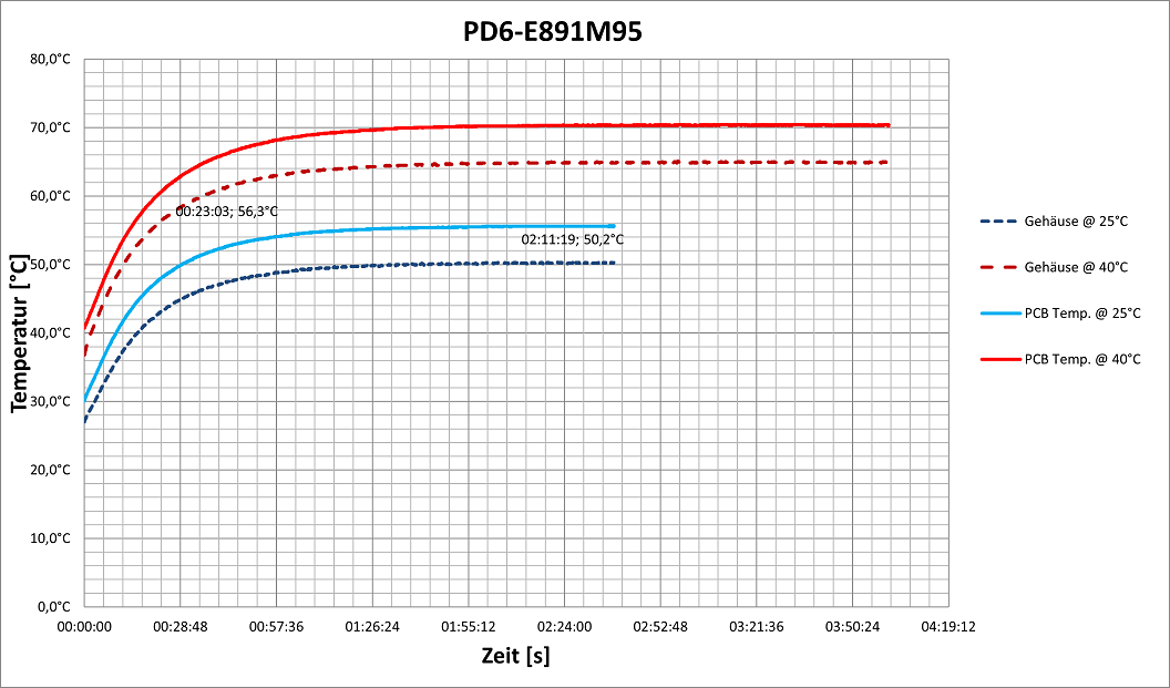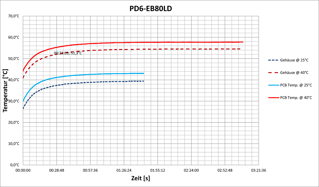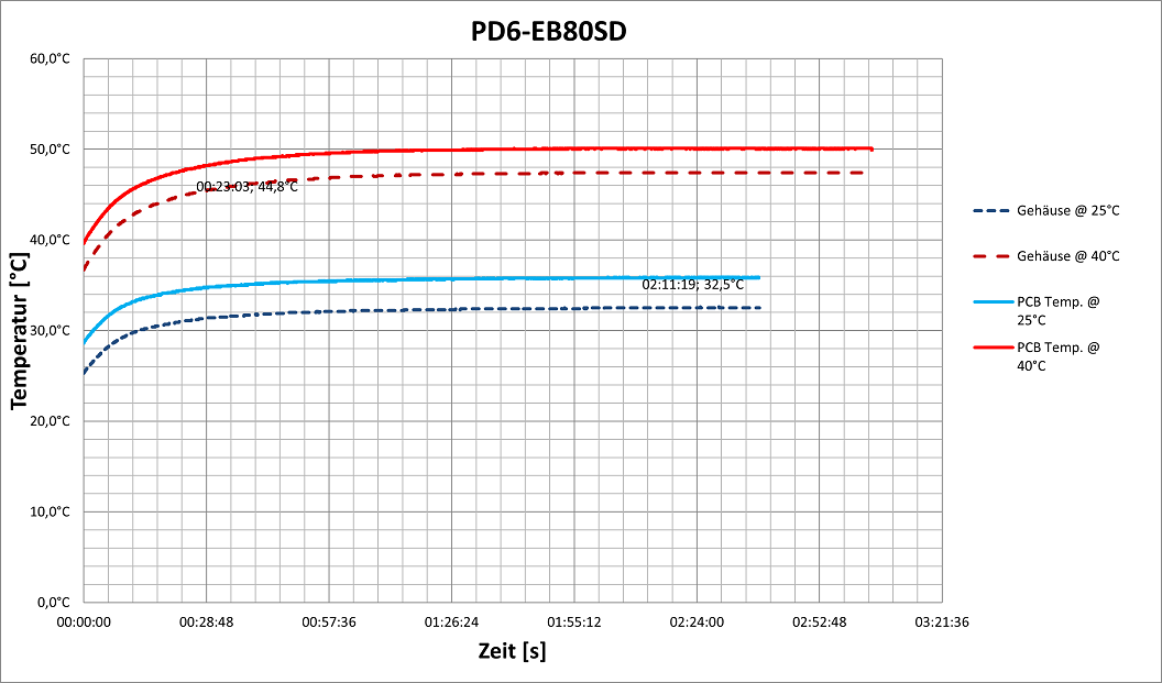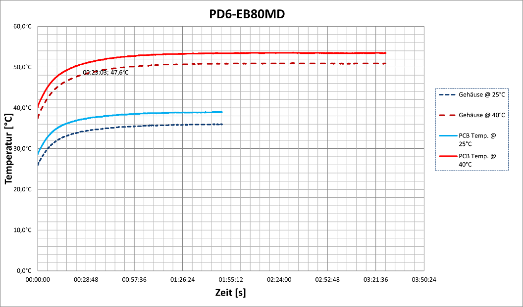 Übertemperaturschutz Ab einer Temperatur von ca. 75°C auf der Leistungsplatine (entspricht 65 - 72°C außen am Deckel) wird das Leistungsteil der Steuerung abgeschaltet und das Fehlerbit gesetzt (siehe Objekt 1001h und 1003h). Nach Abkühlung und dem Bestätigen des Fehlers (siehe Tabelle für das Contolword, "Fault reset") funktioniert die Steuerung wieder normal. Es wurden Temperaturtests unter folgenden Bedingungen durchgeführt: Betriebsspannung / Logikspannung: 48/24 V DC Motorstrom: Nennstrom (siehe Elektrische Eigenschaften und technische Daten) Operationsmodus: Open Loop, Drehzahlmodus 100 U/min Umgebungstemperatur: 25°C / 40°C Aufstellhöhe: 500 m über NN keine externe Kühlung im Klimaschrank, z. B. über Lüfter Motor angeflanscht an Alu-Platte (30 cm x 30 cm x 2 cm) Die folgenden Grafiken zeigen die Ergebnisse der Temperaturtests: Sowohl bei 25 °C als auch bei 40 °C ist der Motor länger als 3 Stunden in Betrieb gewesen ohne Abschaltung. Die Temperatur hat nach ca. 30 Minuten ihr Maximum erreicht und ist danach stabil geblieben. Anmerkung: Da das genaue Temperaturverhalten außer vom Motor auch von der Anflanschung und dem dortigen Wärmeübergang sowie von der Konvektion in der Applikation abhängt, empfehlen wir bei Applikationen, die hinsichtlich Stromhöhe und Umgebungstemperatur problematisch sind, immer einen Dauertest in der realen Umgebung.