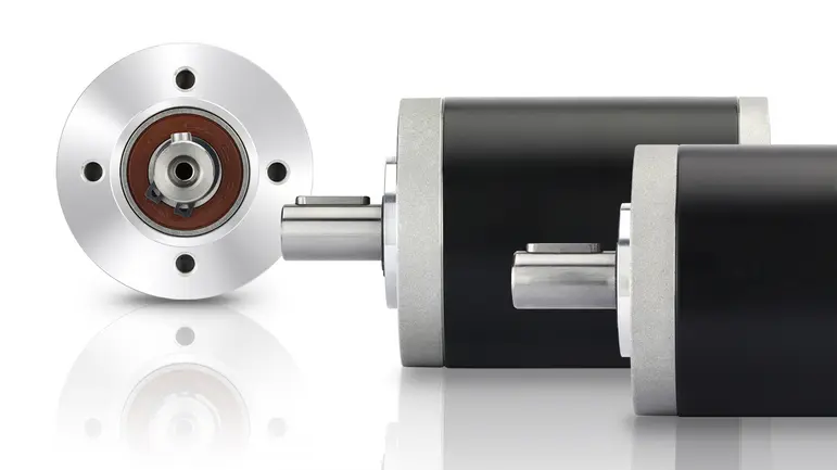 Flat motor with encoder With its 45 mm diameter, integrated encoder and 4,840 rpm rated speed, the DF45-E is ideal for positioning tasks in tight installation spaces. It is easy to control via digital Hall sensors.