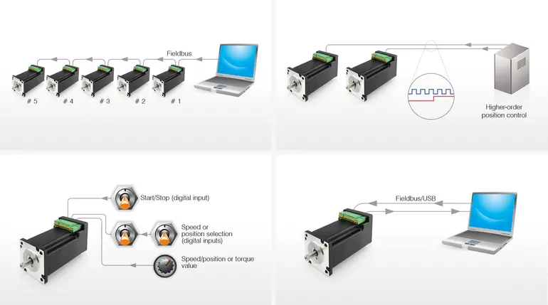 Control methods The Nanotec controllers and motors with integrated controller can be controlled by means of four different methods. DIP switches, configuration files, or software enable the user to select… More details