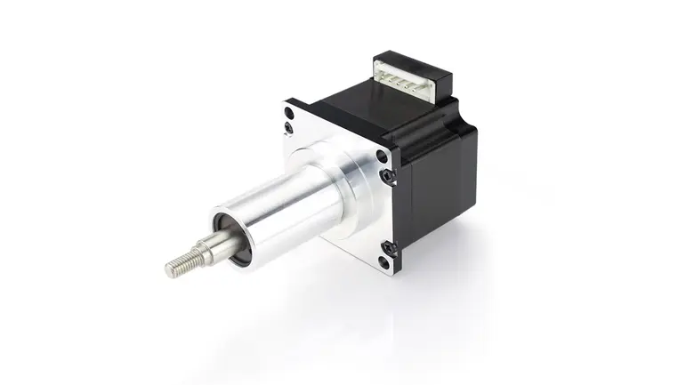 External actuator with 56 mm flange. The lead screw, attached to the motor shaft, is available with trapezoidal or ACME threads. Choose from our broad selection of matching nuts.