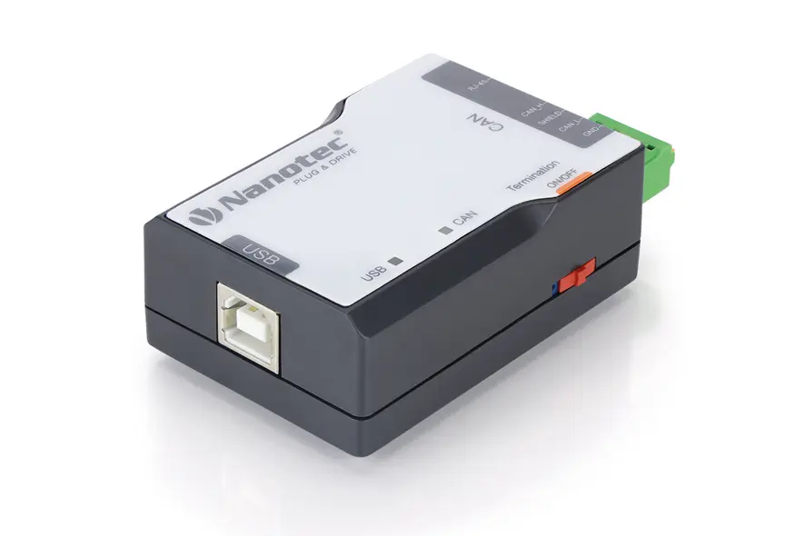 The converter from USB to CANopen is suitable for all motor controllers/drives of the Cx and Nx series as well as the motors of the PDx-Cx and PDx-Ex series with a CANopen fieldbus interface. The converter is electrically isolated to prevent damage to the converter or the connected devices through potential differences.