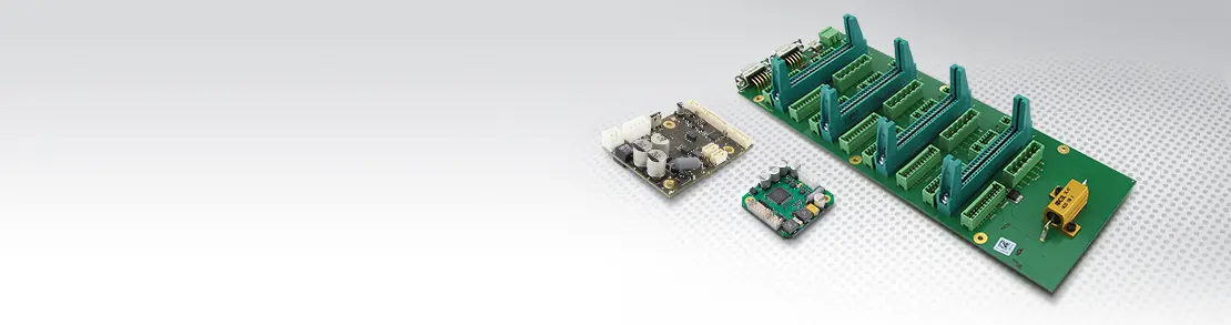 The pictured motherboard for two type SMCP33 plug-in PCBs was developed according to customer specifications from our standard evaluation board. In addition to the motor control, several switching outputs with various voltages and powers were integrated for switching and supplying accessories.