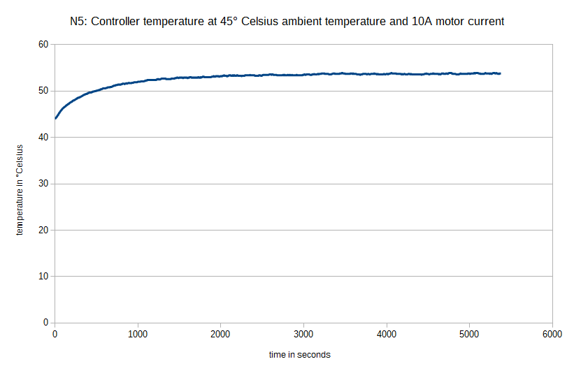 At 45°C (48 V, 10 A rms, Velocity Mode 30 rpm), the N5-1-x was in operation for longer than 1 hour without having been switched off. The temperature was stable at approx. 53°C.