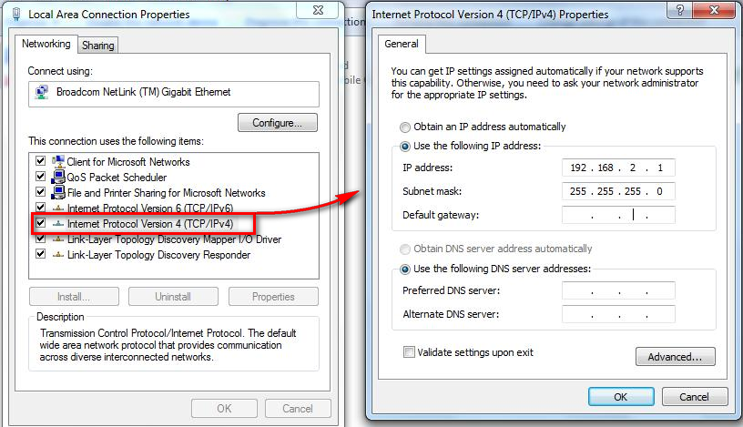 A static IP address is also assigned to the communication partner. Settings using the Windows 7 operating system as an example: