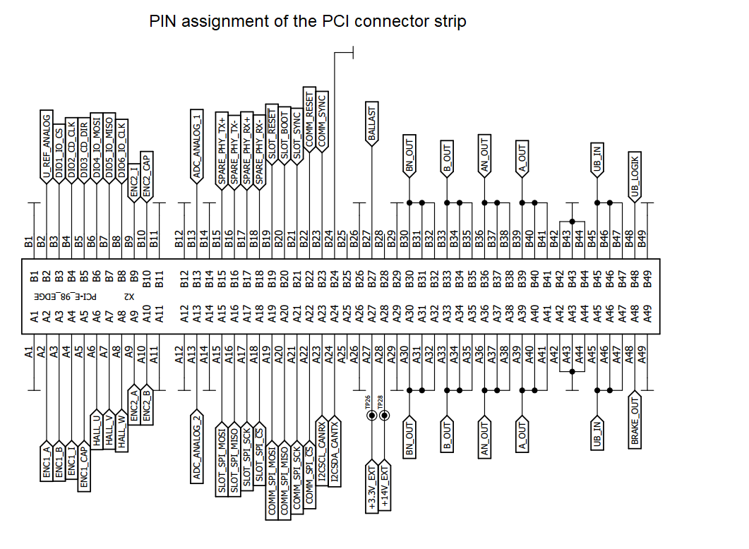 Pin assignment Note: For digital inputs 1 to 6, the switch-on threshold is 1.86 V, the switch-off threshold is 0.91 V DC. The maximum sampling frequency is 1 MHz. If the I/O pins are used as output (see Defining input and output assignments), the maximum admissible current is approx. 10 mA at 3.3 V DC. The range of the analog inputs is 0 … 3.3 V DC. The encoder signal is single-ended, the switch-on threshold is 1.86 V, the switch-off threshold is 0.91 V DC. The maximum sampling frequency is 1 MHz. The current consumption of the UB_LOGIC logic supply is approx. 30 mA at 24 V DC. PCI pin assignment: Pin Name Description/function A1 GND A2 ENC1_A Encoder 1, A A3 ENC1_B Encoder 1, B A4 ENC1_I Encoder 1, Index A5 ENC1_CAP Not used A6 HALL_U (H1) Hall sensor 1 (U) A7 HALL_V (H2) Hall sensor 2 (V) A8 HALL_W (H3) Hall sensor 3 (W) A9 ENC2_A Encoder 2, A A10 ENC2_B Encoder 2, B A11 GND A12 GND A13 ADC_ANALOG_2 Analog input 2: 0 … 3.3 VNode-ID, see Position of the virtual rotary switch A14 GND A15 SLOT_SPI_MOSI A16 SLOT_SPI_MISO A17 SLOT_SPI_SCK A18 SLOT_SPI_CS A19 COMM_SPI_MOSI A20 COMM_SPI_MISO A21 COMM_SPI_SCK A22 COMM_SPI_CS A23 I2CSCL_CANRX CANopen RX , see Connecting the CANopen A24 I2CSDA_CANTX CANopen TX , see Connecting the CANopen A25 n.c. reserved A26 GND A27 +3.3V_EXT Not used A28 +14V_EXT Not used A29 GND A30 BN_OUT B\ (stepper motor) A31 A32 A33 B_OUT B\(stepper motor) or W (BLDC) A34 A35 A36 AN_OUT A\ (stepper motor) or V (BLDC) A37 A38 A39 A_OUT A (stepper motor) or U (BLDC) A40 A41 A42 GND A43 A44 A45 UB_IN 12 … 48 V DC ±4% A46 A47 A48 BRAKE_OUT Control of the external brake, open-drain output, max. 1 A A49 GND B1 GND B2 U_REF_ANALOG 3.3 V DC, reference voltage for analog inputsNode-ID, see Position of the virtual rotary switch B3 DIO1_IO_CS General I/O B4 DIO2_CD_CLK General I/O (clock input in clock-direction mode) B5 DIO3_CD_DIR General I/O (direction input in clock-direction mode) B6 DIO4_IO_MOSI General I/O B7 DIO5_IO_MISO General I/O B8 DIO6_IO_CLK General I/O B9 ENC2_I Encoder 2, Index B10 ENC2_CAP Not used B11 GND B12 GND B13 ADC_ANALOG_1 Analog input 1: 0 … 3.3 V B14 GND B15 SPARE_PHY_TX+ reserved B16 SPARE_PHY_TX- reserved B17 SPARE_PHY_RX+ reserved B18 SPARE_PHY_RX- reserved B19 SLOT_RESET System function, reserved B20 SLOT_BOOT System function, reserved B21 SLOT_SYNC System function, reserved B22 COMM_RESET B23 COMM_SYNC B24 GND B25 n.c. reserved B26 GND B27 BALLAST For controlling an external ballast circuit B28 n.c. reserved B29 GND B30 BN_OUT B\ (stepper motor) B31 B32 B33 B_OUT B (stepper motor) or W (BLDC) B34 B35 B36 AN_OUT A\ (stepper motor) or V (BLDC) B37 B38 B39 A_OUT A (stepper motor) or U (BLDC) B40 B41 B42 GND B43 B44 B45 UB_IN 12 … 48 V DC ±4% B46 B47 B48 UB_LOGIK External logic supply, 24 V DC B49 GND