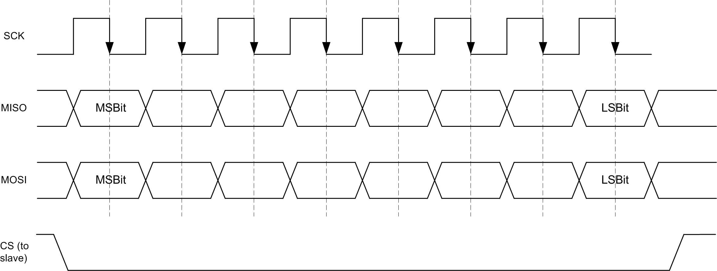 • A bit value (MISO and MOSI) is made available on the rising edge of the clock signal.