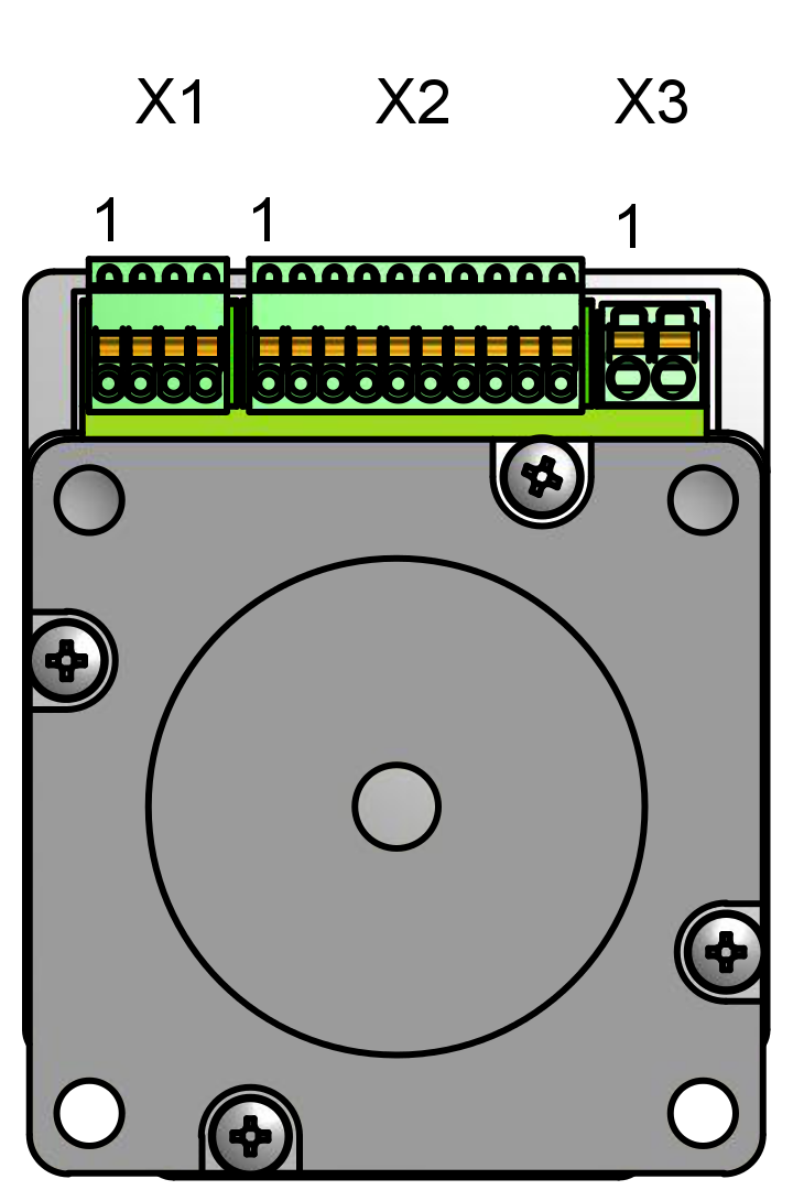 Pin assignment Overview Note: All pins with designation GND are internally connected. X1 − analog inputs and outputs Connections for analog speed mode Type: Phoenix Contact MCV 0.5/ 4-G-2.5 Mating connector (included in scope of delivery): Phoenix Contact FK-MCP 0.5/ 4-ST-2.5 (or equivalent) Nanotec article number: ZCPHOFK-MC0,5-4 Pin Function Note 1 GND 2 Analog input 10 bit, 0-10 V 3 Digital output Open drain, max. 24 V/100 mA 4 Voltage output +12 V, max. 100 mA Connection data min max Conductor cross section, rigid, min. 0.14 mm2 0.5 mm2 Conductor cross section, flexible, min. 0.14 mm2 0.5 mm2 Conductor cross section, flexible, min. Wire-end sleeve without plastic sleeve, min. 0.25 mm2 0.5 mm2 Conductor cross section, min. AWG 26 20 Min. AWG acc. to UL/CUL 28 20 X2 – digital inputs Connection for the digital inputs. Type: Phoenix Contact MCV 0.5/10-G-2.5 Mating connector (included in scope of delivery): Phoenix Contact FK-MCP 0.5/10-ST-2.5 (or equivalent) Nanotec article number: ZCPHOFK-MC0,5-10 Pin Function Note 1 Digital input 1 0/+24 V 2 Digital input 2 0/+24 V 3 Digital input 3 0/+24 V 4 -Release (-input 4) The default setting for this input combination is "single-ended"; this means that the "-Release" input is deactivated, only "+Release" against GND is active. 5 V / 24 V signal, switchable by means of software with object 3240h, max. 1 MHz 5 +Release (+input 4) 6 –Direction (–input 5) The default setting for this input combination is "single-ended"; this means that the "-Direction" input is deactivated, only "+Direction" against GND is active. 5 V / 24 V signal, switchable by means of software with object 3240h, max. 1 MHz 7 Direction (+input 5) 8 –Clock (–input 6) The default setting for this input combination is "single-ended"; this means that the "-Clock" input is deactivated, only "+Clock" against GND is active. 5 V / 24 V signal, switchable by means of software with object 3240h, max. 1 MHz 9 Clock (+input 6) 10 GND Note: All inputs for clock-direction can be switched together between 5 V and 24 V and also between single-ended and differential. The following switching thresholds apply for inputs 1 to 3: Switching thresholds On Off > approx. 16 V < approx. 4 V The following switching thresholds apply for inputs 4 to 6 (pins 4 to 9): Max. Voltage Switching thresholds (worst-case calculations) On Off 5 V > 3.80 V < 0.26 V 24 V > 14.42 V < 4.16 V If you set 3240h:07h to the value "1", three differential inputs are available on pins 4 to 9. Where: Switching on Switching off Voltage at input pin+ against GND > switch-on threshold Voltage at input pin- against GND > switch-on threshold Connection data min max Conductor cross section, rigid, min. 0.14 mm2 0.5 mm2 Conductor cross section, flexible, min. 0.14 mm2 0.5 mm2 Conductor cross section, flexible, min. Wire-end sleeve without plastic sleeve, min. 0.25 mm2 0.5 mm2 Conductor cross section, min. AWG 26 20 Min. AWG acc. to UL/CUL 28 20 X3 – voltage supply Voltage source The operating or supply voltage supplies a battery, a transformer with rectification and filtering, or a switching power supply. Note: EMC: For a DC power supply line longer than 30 m or when using the motor on a DC bus, additional interference-suppression and protection measures are necessary. ► An EMI filter is to be inserted in the DC supply line as close as possible to the controller/motor. ► Long data or supply lines are to be routed through ferrites. Connections Type: Phoenix Contact MCV 1.5/ 2-G-3.5 Mating connector (included in scope of delivery): Phoenix Contact FMC 1.5/ 2-ST-3.5 (or equivalent) Nanotec article number ZCPHOF-MC1,5-2 Pin Function Note 1 +Vcc PD4-C: 12-48 V, ±5% PD4-CB: 12-24 V, ±5% 2 GND Connection data min max Conductor cross section, rigid, min. 0.2 mm2 1.5 mm2 Conductor cross section, flexible, min. 0.2 mm2 1.5 mm2 Conductor cross section, flexible, min. Wire-end sleeve without plastic sleeve, min. 0.25 mm2 1.5 mm2 Conductor cross section, flexible, min. Wire-end sleeve min. Plastic sleeve min. 0.25 mm2 0.75 mm2 Conductor cross section, min. AWG 24 16 Min. AWG acc. to UL/CUL 24 16 Permissible operating voltage The maximum operating voltage is 50.4 V DC for the stepper motors (PD4-C) and 25.2 V for the BLDC motors (PD4-CB). If the input voltage of the controller exceeds the threshold value set in 2034h, the motor is switched off and an error triggered. Above the response threshold set in 4021h:02h, the integrated ballast circuit is activated (wirewound resistor Z32041412209K6C000 from Vishay with 3 W continuous output). The minimum operating voltage is 11.4 V DC. If the input voltage of the controller falls below 10 V, the motor is switched off and an error triggered. A charging capacitor of at least 4700 µF / 50 V (approx. 1000 µF per ampere rated current) must be connected in parallel to the supply voltage to avoid exceeding the permissible operating voltage (e.g., during braking). Note: Damage to the controller and/or its power supply due to excitation voltage of the motor! Voltage peaks during operation may damage the controller and possibly its power supply. ► Install suitable circuits (e.g., charging capacitor) that reduce voltage peaks. ► With BLDC motors: Select a voltage source that corresponds to the rated voltage of the respective motor as specified in the motor data sheet. ► Use a power supply with protection circuit to protect against overvoltage.