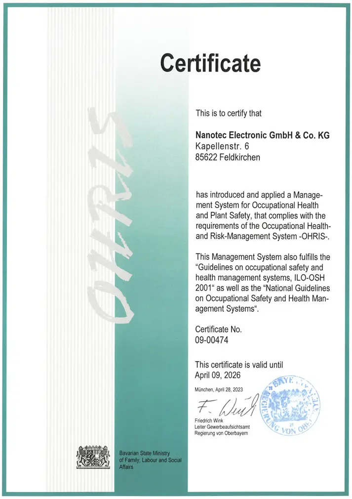 Our company aims for the highest standards in health protection, occupational health and safety, and safety at the workplace. We work ceaselessly on improvements beyond the requirements demanded by law. To implement the improvement process regarding occupational health and safety protection in a consistent, structured and sustainable manner, we involved the Trade Supervisory Office in the relevant company processes. It confirmed the effectiveness of our occupational health and safety protection system with the OHRIS certificate.
