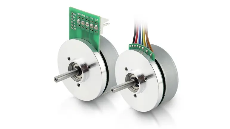 Flat external rotor motor with 16 poles, a rated power of 30 – 65 W and a rated speed of up to 5,260 rpm. 24 V DC rated voltage. Diameter: 45 mm.